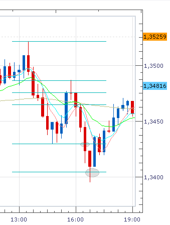 Tudi tu sem trgoval preboj. Ko se je tečaj tretjič dotaknil padajoče trendne linije kanala in ni padel pod 100 SMA temveč se od nje odbil, sem ob preboju kanala takoj odprl LONG pozicijo s ciljem 1.3505, kajti malo nad tem poteka prvi odpor in že sama okrogla številka kot taka je lahko točka kjer se tečaj lahko dlje časa zadržuje. Tudi ta cilj je hitro dosežen, prinesel je malo več kot 20 pipov.